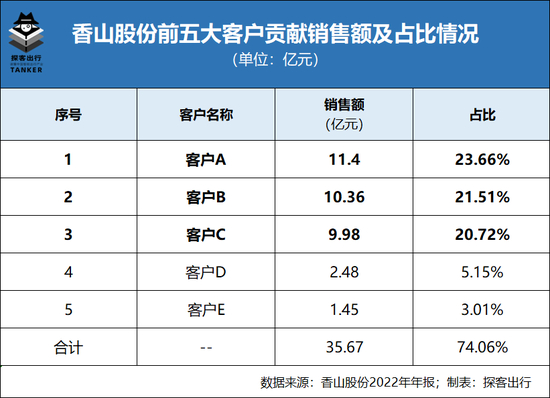 ‘探客出行’从香山股份2022年报获悉,香山股份的前五大客户累计销售额约35.67亿元,占全年总营收的74.06%。尤其是前三大客户直接贡献了31.74亿元的营收,占总营收的65.89%。
