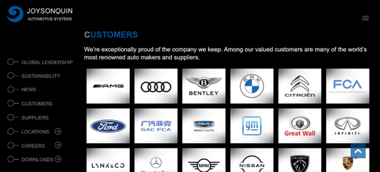 ‘探客出行’从均胜群英的官网发现,上至宾利、保时捷和BBA这种豪华品牌,下至长城、吉利和丰田等入门家用品牌,累计20余家汽车厂商都是均胜群英的合作客户。