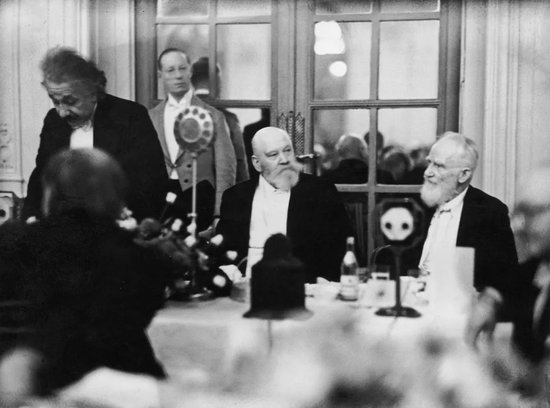 ▲(1930年10月,萧伯纳与爱因斯坦出席萨沃伊酒店的晚宴。两人中间的是第二代罗斯柴尔德男爵沃尔特·罗斯柴尔德。)