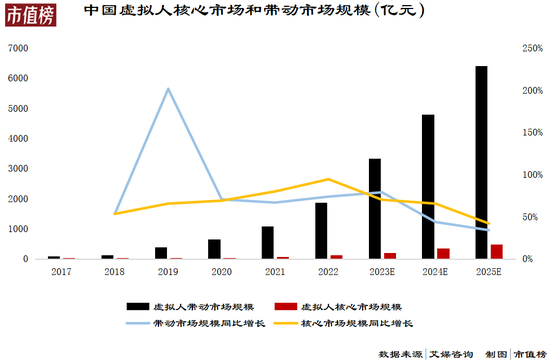 艾瑞咨询的研究报告显示,2022年中国虚拟人带动产业市场规模和核心市场规模分别为1866.1亿元和120.8亿元,预计2025年分别达到6402.7亿元和480.6亿元,呈现强劲的增长态势。