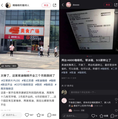 最近,不少库迪加盟商在抖音、小红书等社交平台“诉苦”,有的“开三个月就亏损倒闭”,有的更是就地开始转让咖啡机,希望能回点血。