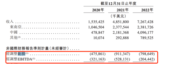体现到招股书上,2020-2022年,极兔经调整净亏损分别为4.76亿美元、9.1亿美元、8亿美元。而从经调整EBITDA上看,极兔2020年、2021年、2022年经调整EBITDA分别为-3.21亿美元、-5.28亿美元、-2.04亿美元。