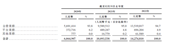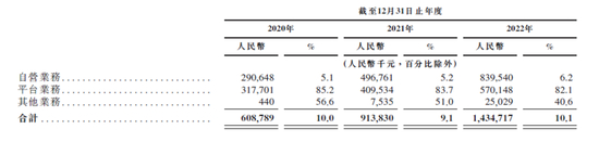 2019年至2022年,公司自营业务带来的收入分别为30.12亿元、56.91亿元、95.89亿元和135.19亿元,占总营收比例分别为92.7%、93.8%、95%和94.7%。相比之下,平台业务的营收规模就小多了,分别为2.38亿元、3.72亿元、4.89亿元和6.94亿元。可以说,药师帮绝大部分营收都来自于自营业务。