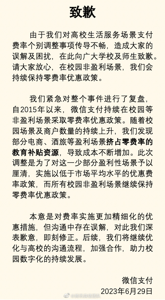 登上热搜后,6月29日,微信和腾讯微信团队针对此事做出公开致歉称,自2015年起,微信支付开始进入校园,对于校园内非盈利性支付场景(学杂费、生活服务等)长期给予零费率的优惠政策,持续投入大量成本。