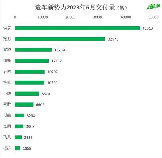 截至7月1日公布的数据,埃安连续四个月交付超四万辆,6月交付新车45013辆;理想又是毫无悬念,冲破了三万辆,完成32575辆的交付,而其他几家还在一万辆上下徘徊。