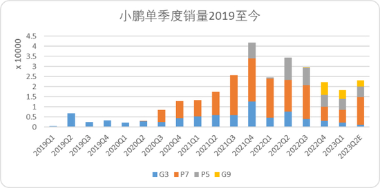 图:小鹏单季度车型销量,来源:锂解、汽车流通协会及财报