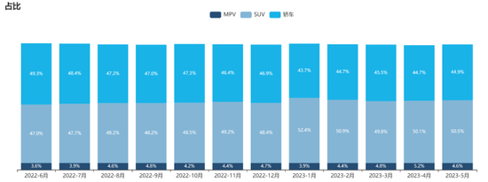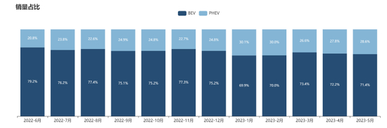 根据乘联会的数据,自2022年8月份以来,SUV就已经成为乘用车市场中最主流的市场,并且市场份额逐步提升,而在新能源细分市场中,虽然混动的占比有明显上升的趋势,但是纯电依旧占据着新能源市场近7成的份额。