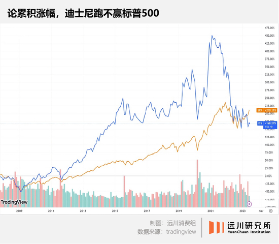 但热情的中国城市,拯救不了迪士尼当下的窘境:躺在地上的电影票房、越努力越心酸的流媒体业绩、饱受争议的文化立场……反映到股价上,过去十年,迪士尼一直跑赢大盘的存在,到了2022年,迪士尼股价腰斩,且罕见的被大盘甩在身后,市值相比最高点已经跌去了2000亿美元。