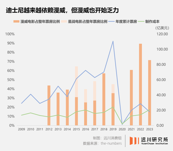 受疫情影响,全球电影业哀鸿遍野,迪士尼也不能幸免。从2020-2023年,迪士尼的票房收入在20亿美元徘徊,而这只是2019年百亿票房的1/5,曾经被寄予厚望的漫威系列,也哑火了。