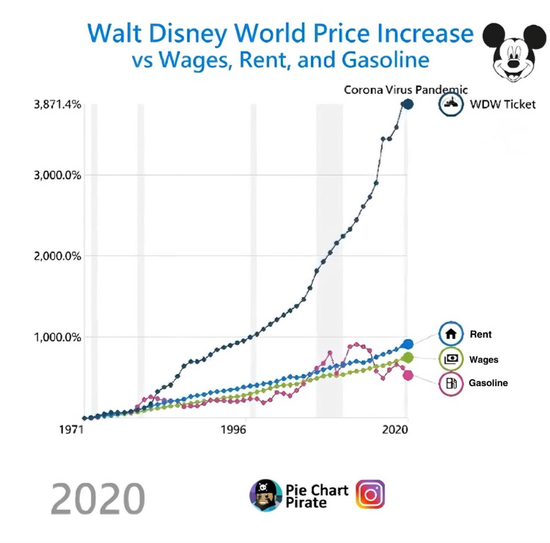 根据《纽约邮报》报道,过去50年,迪士尼门票价格上涨了近40倍,远超工资、租金和汽油的涨幅[13]。但迪士尼还嫌门票不够贵,在娱乐影视、流媒体业务一片灰暗之下,迪士尼只能寄希望于主题乐园。