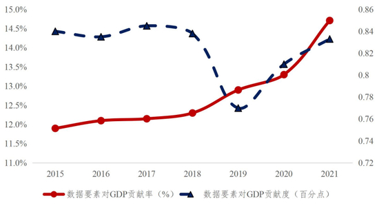 具体到数据要素身上,数据要素对当年GDP增长的贡献率呈现持续上升状态,线性推演下来,未来还有较大空间。