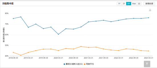 以景顺长城新兴成长A为例,其2021年一季度末的持股集中度(基金持仓的前十大重仓股的市值占全部股票市值的比例)高达72%,而同期同类基金的持股集中度只有48%。尽管自2021年,以白酒、医药等为代表的抱团股行情结束,但景顺长城新兴成长A的持股集中度却是在不断走高,到今年一季度末已上升到了76%,而同类基金逐步降低到了44%。