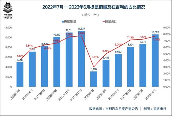 「探客出行」整理极氪和吉利在2022年7月到2023年6月数据发现,极氪在2022年四季度就已经实现了连续三个月的月销过万记录,然而到了2023年1月便出现了环比72.51%的大幅下降,2023年1月的销量仅有2022年12月销量的27.49%。