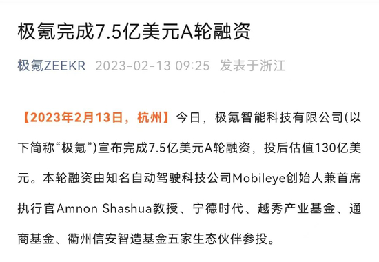 「探客出行」从天眼查获悉,2023年2月极氪汽车完成了第三轮融资,融资金额达7.50亿美元,融后估值达130亿美元(约合900亿元人民币)。彼时,吉利汽车的市值也才1150亿港元(约合近1055亿元人民币)。