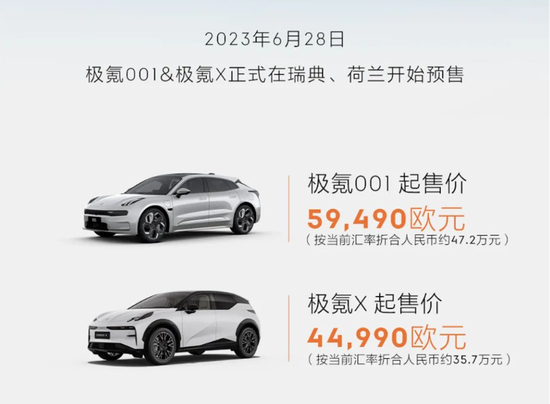 4月18日,极氪携极氪X、极氪001和极氪009以及极氪M-Vision概念车亮相上海车展,同时官宣将开拓欧洲市场。6月底,极氪X和极氪001在瑞典和荷兰两地正式开启预售,其中,极氪X起售价为44,990欧元(约合人民币35.7万元),极氪001起售价59,490欧元(约合人民币47.2万元)。