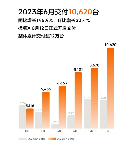7月1日,极氪宣布6月新车交付约1.06万台,同比增长146.9%,环比增长22.4%。已实现了连续5个月同比和环比的正增长,极氪品牌整体累计交付量超12万台。