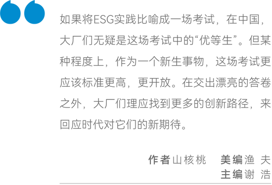 如果将ESG实践比喻成一场考试,在中国,大厂们无疑是这场考试中的“优等生”。但某种程度上,作为一个新生事物,这场考试更应该标准更高,更开放。在交出漂亮的答卷之外,大厂们理应找到更多的创新路径,来回应时代对它们的新期待。