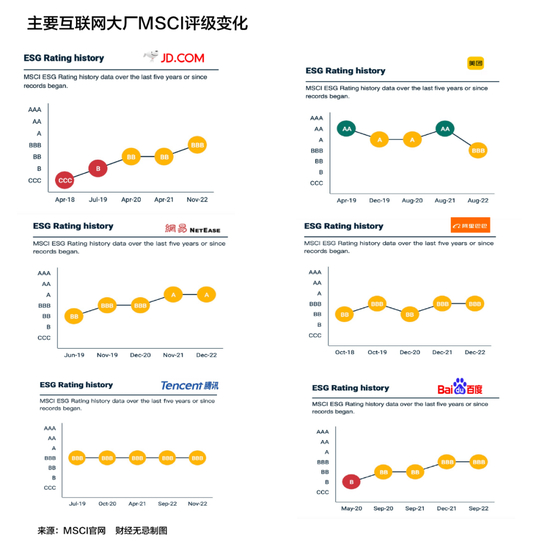 以目前较为权威的ESG指标之一——摩根士丹利资本国际公司所编纂的全球型指数MSCI为例,大厂们的评级确实不尽如人意,整体维持在B级区间,处于“中等水平”。比如,腾讯一直处于BBB级,美团曾两次获得AA评级,但目前降到了BBB级,京东则是从2017年的CCC级上升到目前的BBB级,唯一表现不错的网易,目前的评级为A级。