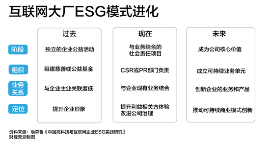 比起定期发布的财报成绩单,大厂们的ESG报告尽管诞生不久,但其ESG模式也出现了明显的进化,逐步从过去较为单一的公益活动走向了公司核心价值或战略,与业务的关联度也越来越紧密。