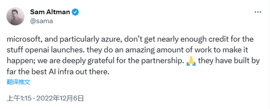 Altman本人甚至还曾经专门发推对Azure团队的给力支持表示感谢,高度评价微软是“世界上最好的AI基础设施”。