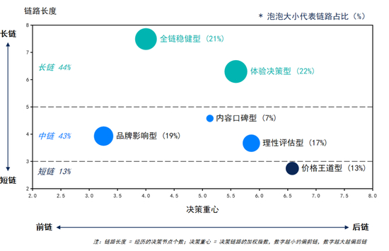 另一条长链为全链稳健型,占比21%,其依赖社会共识性,需要品牌力的长期建设,主要受众为依赖线下渠道和熟人社交的下沉市场,媒介入口最为广泛,全媒介,因此对品牌提出综合布局的要求。对于此类消费者,品牌长期投资所营造的环境声量会发挥重要作用,要求品牌坚持长期主义,进而实现全渠道触点的主动触达,累积认知共识。