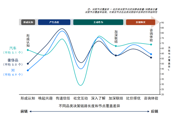 模型发现,汽车决策链路平均有5.1个决策节点,相比起奢侈品类、3C类更长、更均衡。此外,相对于这两个品类决策链路节点特征来说,汽车消费更多涉及家庭、消费频次更低,社交互动相对更弱,社交互动之外的其他决策节点更重也更均衡,更加强调前链及后链。