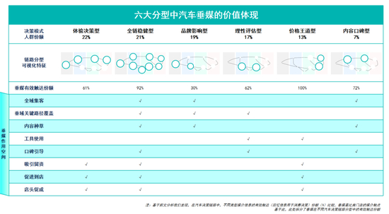 以上六大分型,消费者或偏真实体验类触点,或偏传统/曝光型触点,或青睐主动搜索,或依赖内容种草,共同编织出汽车消费者这个群体网络。在通过该模型进行整合研究之后,有了一个核心的发现:垂媒是影响全链路的媒介,只是对于不同决策链路的人群,起着不同的作用。