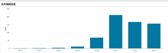 3年波澜不惊之后,工银前沿医疗A终于在2019年迎来了爆发,这一年规模一下子猛增到了11.4亿元。此后更是一发不可收拾,2020年达到68亿,2021年更是一下子飙升到了211亿。