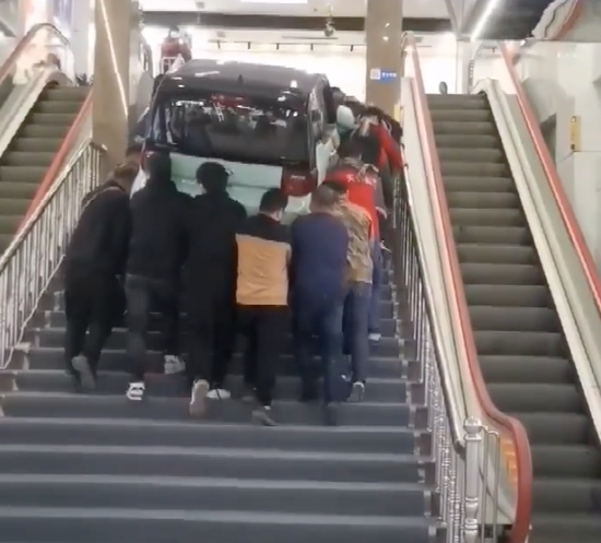 “商场有载货电梯,汽车坐电梯上来的。”这场有关人力大工程的幻想顿时烟消云散。