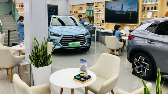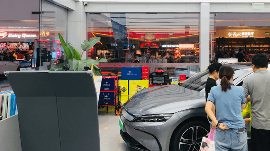 比亚迪的销售指了指外面的展台,环顾自家带电视、桌椅吧台、光线明亮的门店:“我们是最早来商场办商超店的一批。”