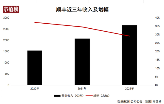 从营收规模来看, 2020年到2022年三年,顺丰的营业收入分别为 1539.87亿元、2071.87亿元和2674.90亿元,但收入增速同比也在出现逐年下降,分别为37.25%、34.55%和29.11%。