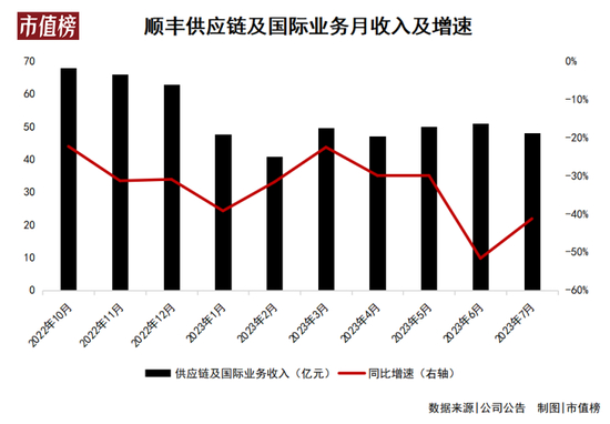 从去年的第四季度开始到今年7月,顺丰供应链及国际业务收入已经连续10个月出现同比下滑。今年6月和7月,下降幅度分别超过了50%和40%,并且带动顺丰整体的月度收入(不含丰网)出现15.96%和13.68%的缩水。