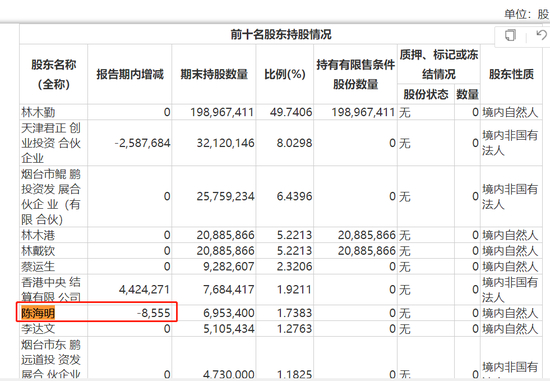 不仅如此,财报显示,东鹏饮料十大股东之一陈海明在今年上半年减持公司8555股,而陈海明同样为陈惠玲的兄弟。