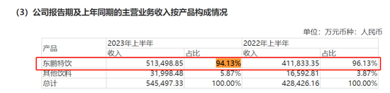 而过度依赖“东鹏特饮”这一单品一直是东鹏饮料的痛点,财报显示,2023年上半年,94.13%的主营业务收入来自于“东鹏特饮”。