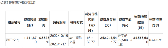 就在第一轮减持周期结束的第二天,君正投资就马不停蹄地披露了第二轮的减持计划,最终减持141.14万股,套现2.50亿元。