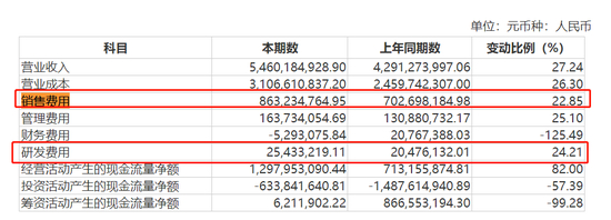 财报显示,东鹏饮料投入到研发中的费用甚至比不上推广费用。2023年上半年,企业的研发费用、销售费用分别为2543.32万元、8.63亿元。