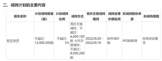 按照规定,公司第二大股东君正投资IPO前持有的股份限售期为12个月,到2022年5月27日限售期正式届满。到期两天前,东鹏饮料就收到了君正投资的减持计划,其计划3个月内合计减持不超过1200万股股份。