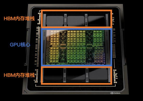 在芯片剖面图中,H100裸片占据核心位置,两边各有三个HBM堆栈,加起面积与H100裸片相当。