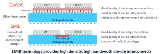 类似的还有英特尔的EMIB,区别在于通过硅桥实现互联。但带宽远不及硅中介层,考虑到带宽与数据传输速率息息相关,CoWoS便成了H100的唯一选择。