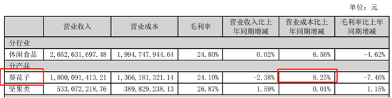 在营收下滑的情况下,葵花子产品的营业成本仍在上升。2022年半年报显示,葵花子产品营业成本比上期增加15%,而一年后,成本再度增加8.25%,导致毛利率同比下滑7.46%。