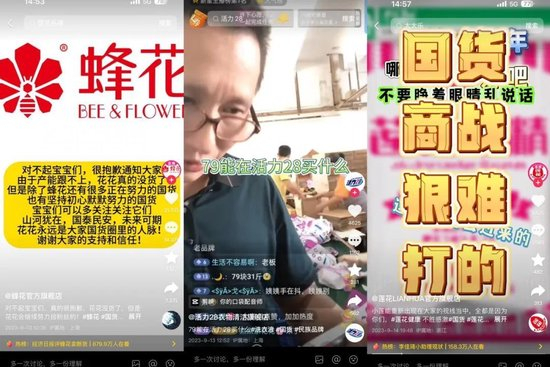 一时间,国货品牌流行起了抱团商战,“整个国货圈乱成了一锅粥”:蜂花直播间卖断货后,开始推荐鸿星尔克的鞋;鸿星尔克的直播间则用蜂花洗头,吃白象方便面,喝汇源果汁,背景音乐还放着蜜雪冰城;护肤品牌郁美净连夜注册的抖音、小红书账号下面,评论区里都是蜂花、莲花、拉芳等国货品牌亲昵地喊着“宝,你来晚了”。