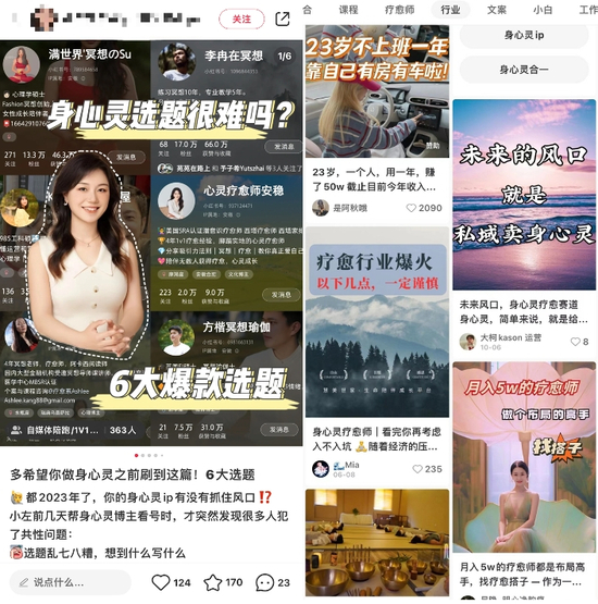 其实不光是贴文,就连心灵导师本身,许多也是流水线的产物。培训机构不遗余力地鼓吹着身心灵行业的暴利,“月入五万”“下一个风口”,这些充满噱头的贴文下面,咨询详情的人络绎不绝。