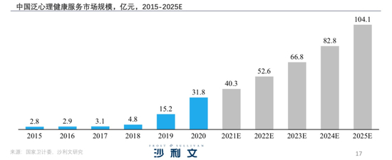 咨询公司沙利文发布的《2022中国泛心理健康服务行业白皮书》显示,中国泛心理健康服务市场规模由2015年的2.8亿元增长至2020 年的31.8亿元,年复合增长率达62.9%。据预计,2025年中国泛心理健康服务市场规模将达到104.1亿元,年复合增长率将达到34.5%。