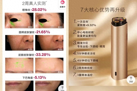 不仅如此,觅光的美容仪自面世以来便饱受“智商税”的争议与质疑。以该品牌淘宝旗舰店销量最高的深层射频美容仪为例,该产品在宣传时称“1次显效,紧致度+9.32%”,并辅以两周真人实测的前后对比图吸引消费者眼球。