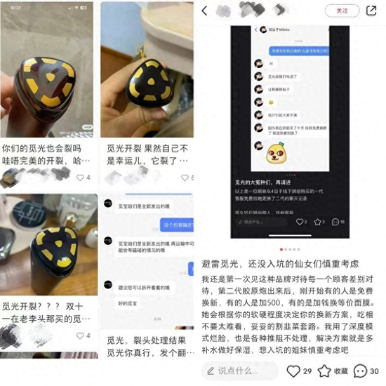 不仅如此,小红书上关于觅光深层射频美容仪开裂的笔记也不在少数。而随着觅光胶原炮第二代的问世,一场品牌与消费者之间的拉扯拉开了序幕,不少消费者反映觅光的“以旧换新”制度存在差别对待的情况,售后体验极差。