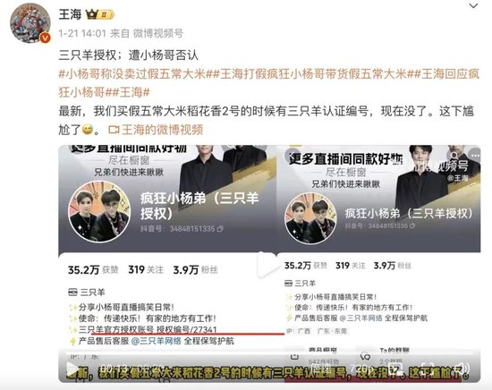 不过,王海进一步放出新的证据称,假的五常大米是在三只羊MCN认证的官方授权账号“疯狂小杨弟”橱窗里购买的,该账号简介中显示归属MCN机构为三只羊,并且标明“产品售后客服@三只羊网络全程保驾护航”,三只羊客服也确认过“疯狂小杨弟”就是它们的授权店铺。