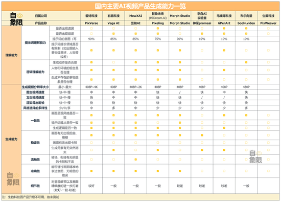 为了探究这个问题的答案,「自象限」通过国内已有的视频生成产品进行实际体验,并结合公开信息、第三方检测机构数据等多个维度,对当下主流的视频生成模型进行了全面评估。