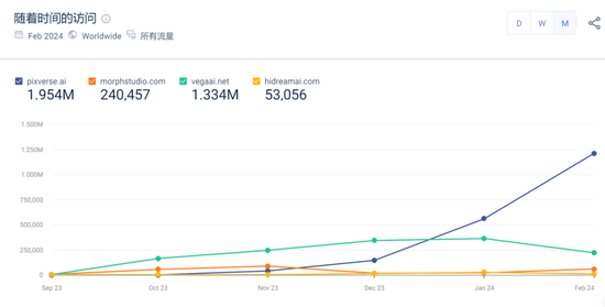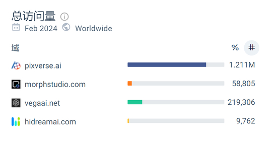 ▲PixVerse,与Pika,Runway产品页面2024年2月数据对比