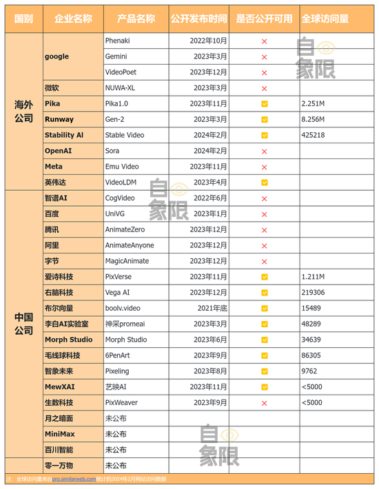 ▲图:国内外视频生成大模型企业一览,访问量以2024年2月计