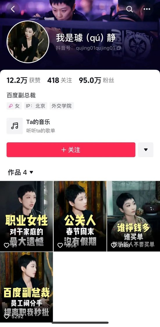 璩静的成长履历不可谓不光鲜,一路走来都是人中龙凤般的存在,其毕业于外交部唯一直属高校外交学院,在新华社有过十年采访工作的历练,后来入职华为,又一路成长为公共及政府事务部副总裁和中国媒体事务部部长,2021年璩静加入百度,担任副总裁及公关1号位。
